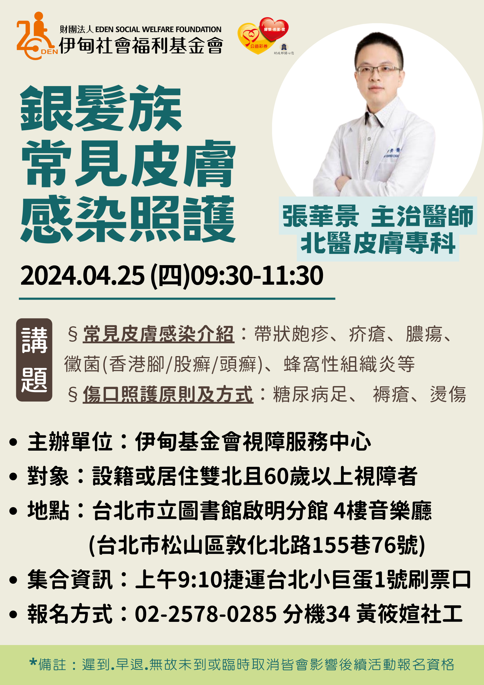 台北【4/25上午-協助視障者】銀髮族常見皮膚感染照護講座