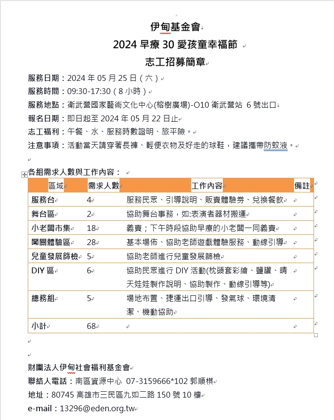 伊甸基金會早療30,愛孩童幸福節活動志工招募