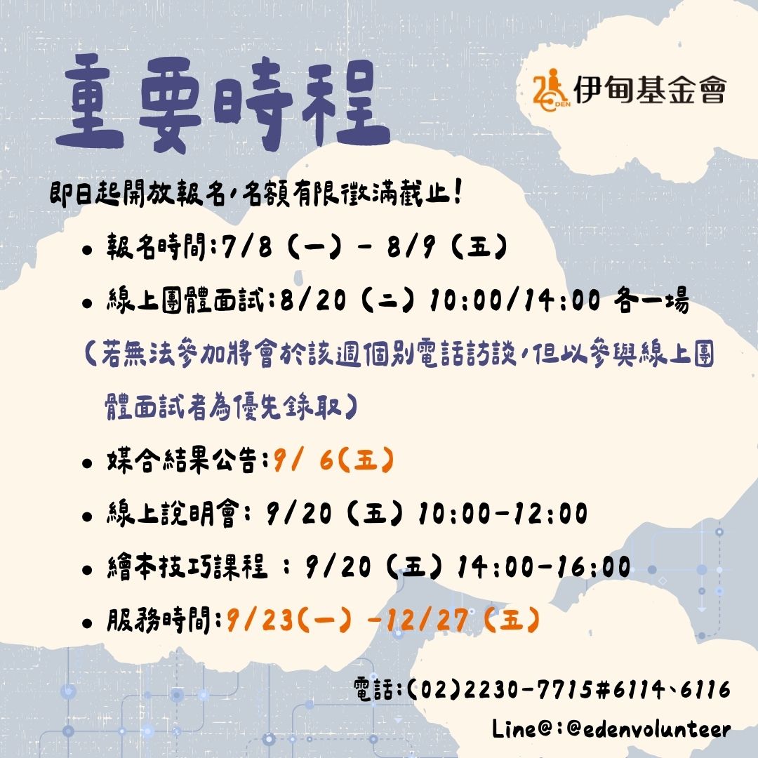 *最終服務媒合結果將於9/6(五)公告至 伊甸志工專區 與 伊甸志工站出來臉書粉專。