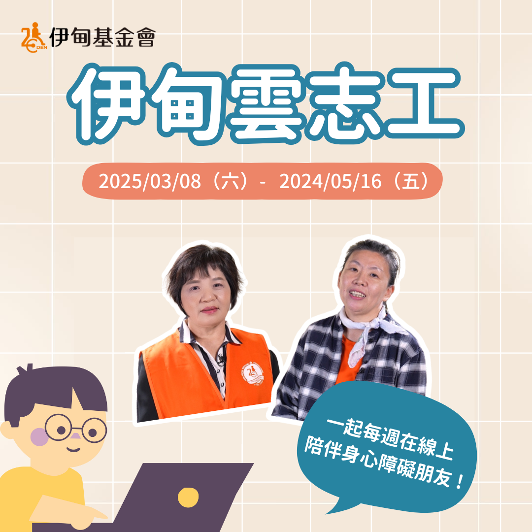 誠摯邀請您加入「伊甸雲志工服務」,與身心障礙者一起度過難忘的時光。志工服務不僅讓你在忙碌生活中找到屬於自己的意義,更能透過每次的陪伴,讓彼此的心靈產生共鳴,收穫無形的滿足與成長。