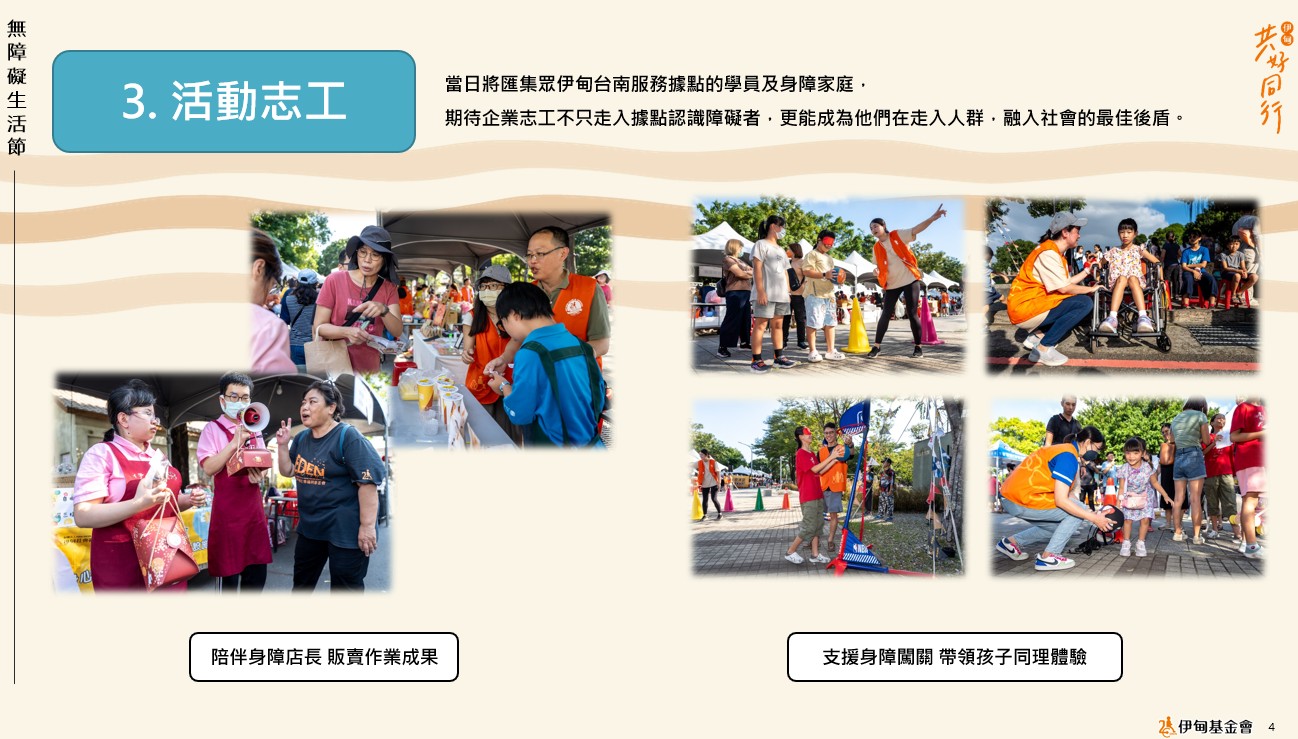 服務內容:協助攤位義賣、身障體驗活動、路線引導、場地復歸、場地清潔整理