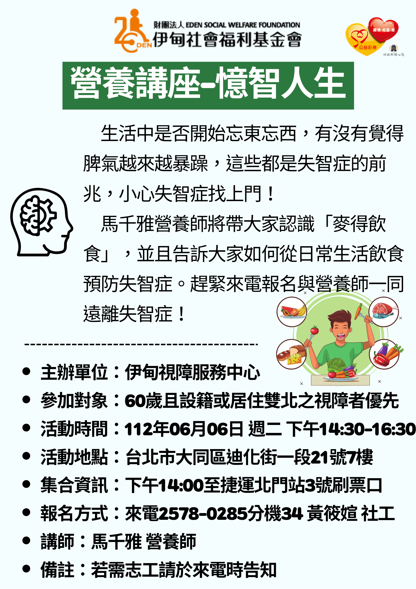 台北市【6/6週二下午/協助視障長者】營養講座-憶智人生