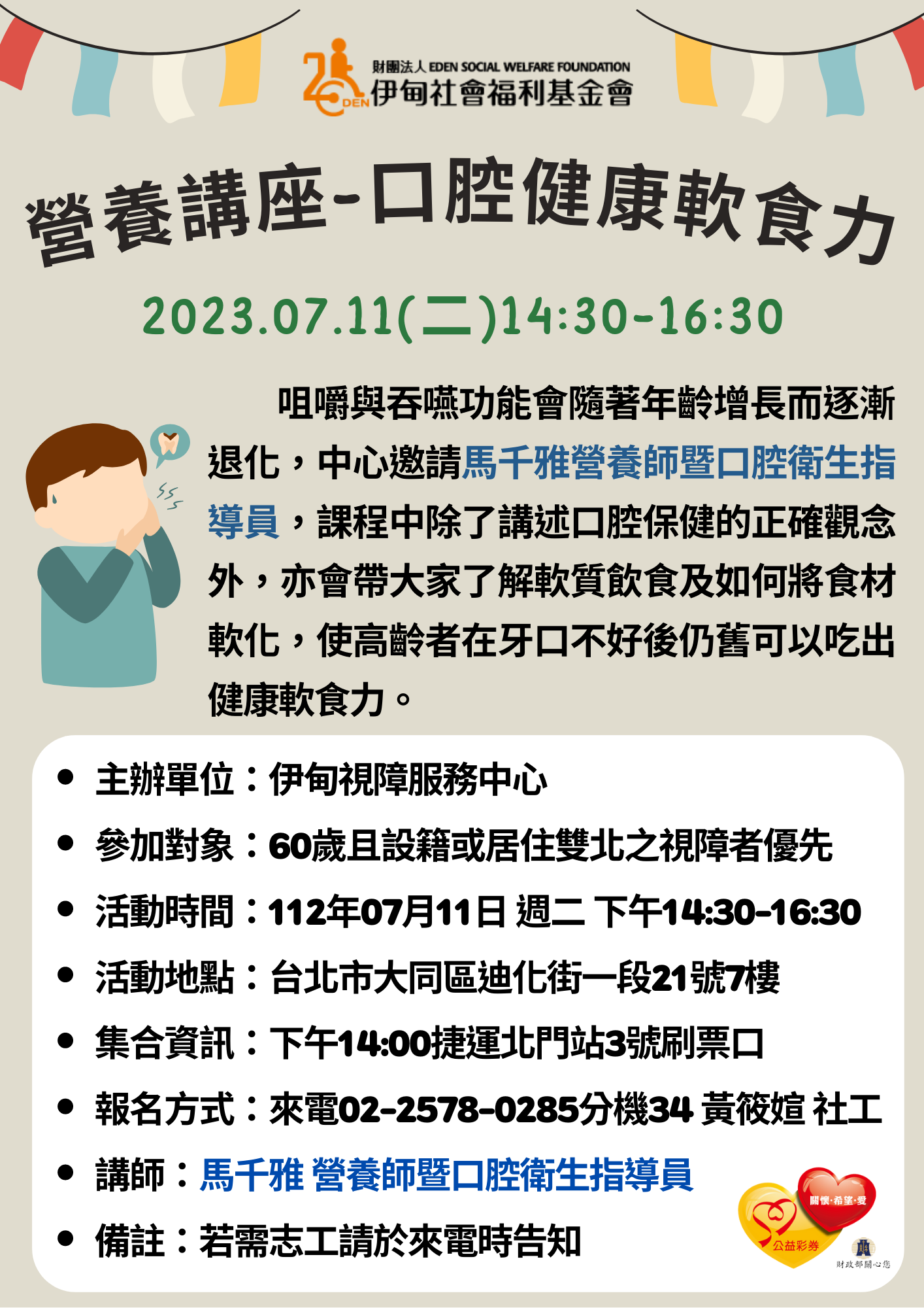 台北市【7/11下午/協助視障長者】營養講座-口腔健康軟食力
