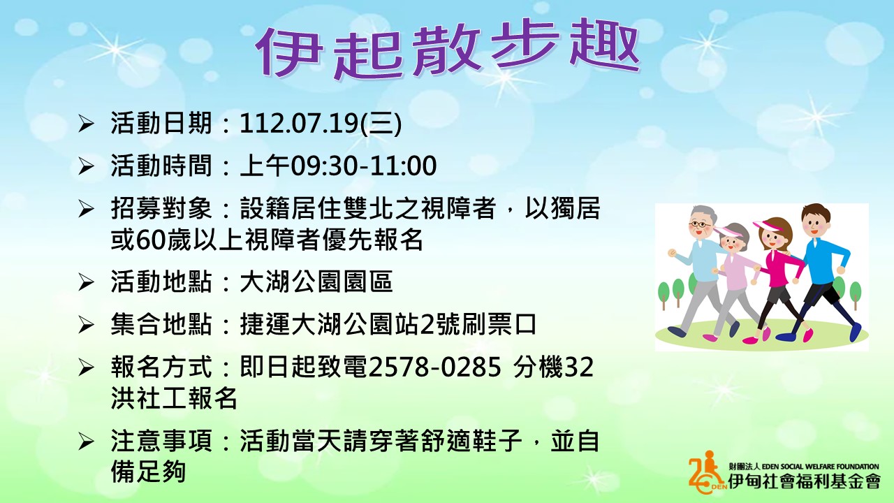 台北市【7/19上午/協助視障長者】伊起散步趣-大湖公園
