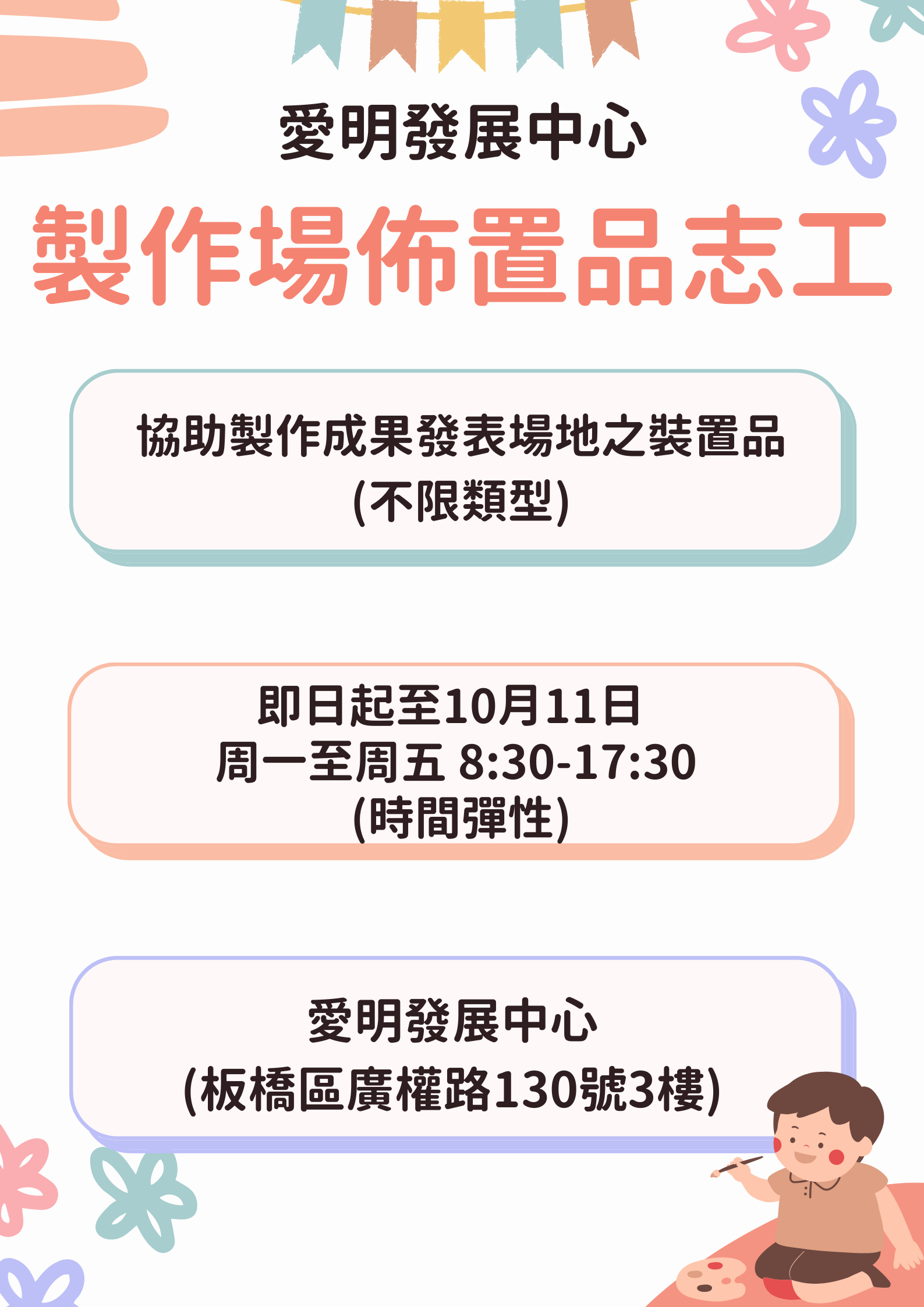 協助製作10月12日成果發表場地之裝置品(不限類型,材料費由中心負擔)