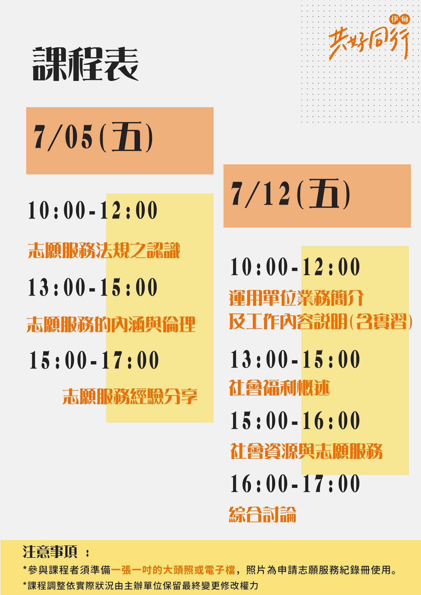 為製作結業證書,請於7/12(五)攜帶一吋大頭照1張或提供照片電子檔,背面以正楷書寫志工姓名及身分證字號。