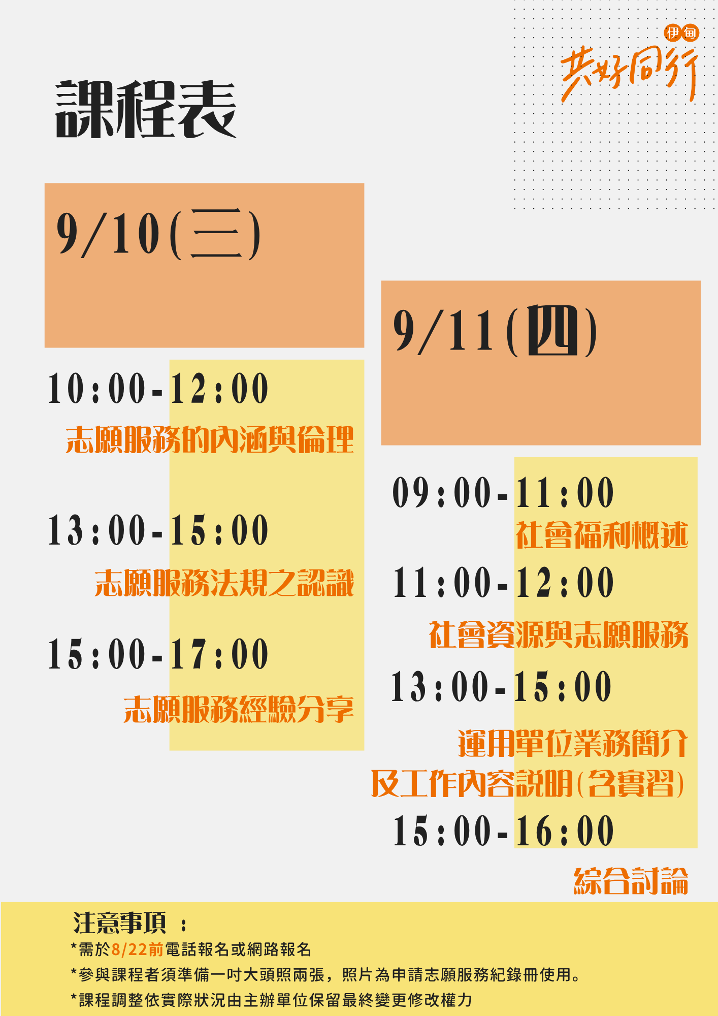 - 為製作結業證書,請於9/11(四)攜帶兩吋大頭照1張,背面以正楷書寫志工編號及志工姓名。