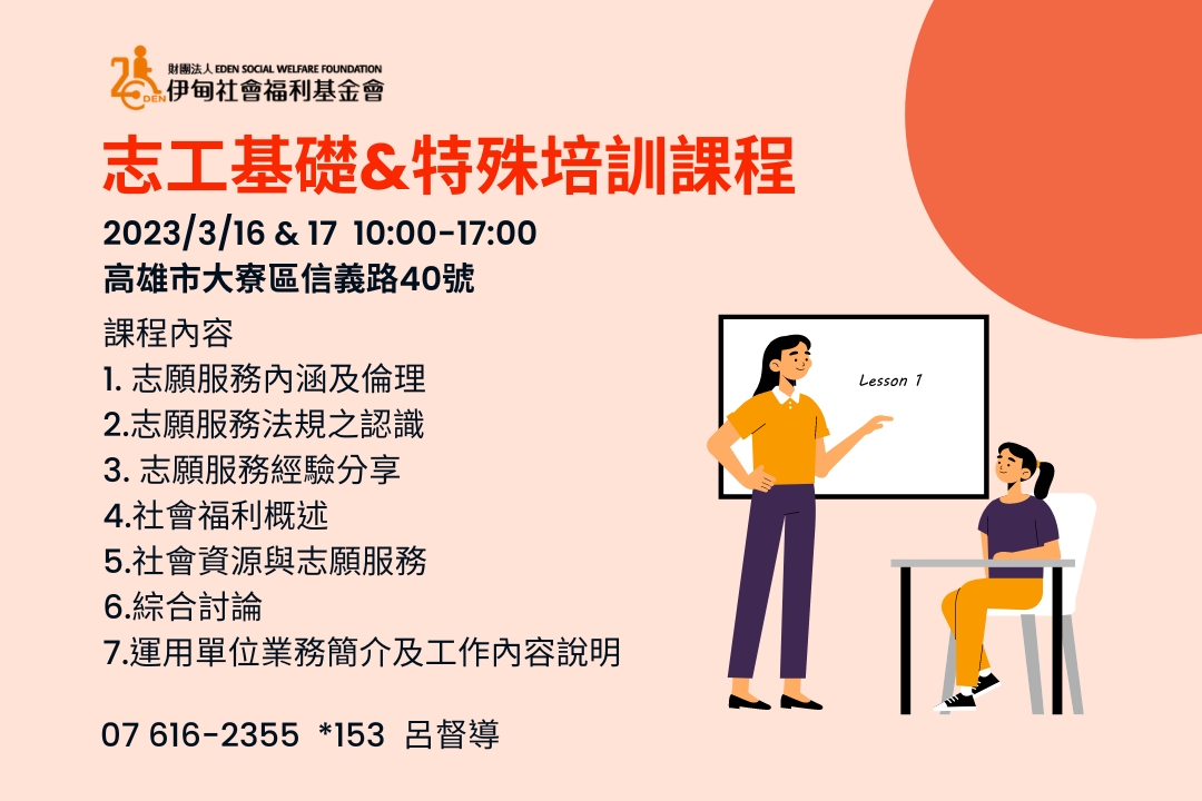 - 聯絡人:07-6162355*153 志工招訓中心 呂怡蓁